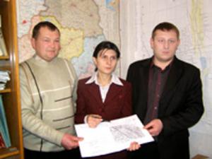 НА СНИМКЕ: Ведущий специалист Олег Иванов (слева направо), начальник землеустроительной и геодезической службы Житковичского района Светлана Панкратова и заместитель начальника Василий Балук за согласованием земельного участка для реконструкции торгового павильона.
