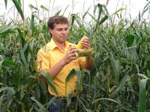 На фото: заместитель директора, главный агроном ОАО «Туровщина» Николай Пиявко в урочище «Цагельня» за проверкой урожкая кукурузы француской селекции гибрид ЕВРОСТАР.Фото автора.