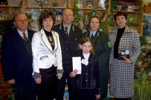 НА СНИМКЕ: учащаяся 4 класса СОШ №4 Ирина Туровец, методист отдела образования В. Никонович, директор Житковичского лесхоза М. Левкович, заместитель директора по идеологической работе Н. Шабаева, инженер по лесовосстановлению И. Крякина, директор СОШ №4 Т.Кузьмич во время церемонии награждения.