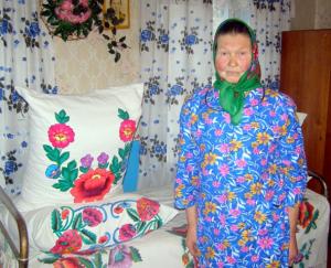 І дома круцілася, як вавёрка ў тым коле. Неяк здарыўся ў яе пералом нагі, дык пакуль яна гаілася — чатыры падушкі вышыла. Памятае яшчэ, як прала і ткала, хоць і гарачая пара наступала, але па маладосці часу на ўсё хапала.