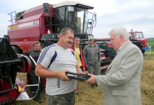 Что ж, настрой понятен. Хочется убрать хлеб быстро и качественно, но матушка-природа вносит свои коррективы. И поэтому сейчас как никогда ощущается реальная битва за урожай, так как в сложных условиях приходится бороться за каждое выращенное зернышко. А оно ведь есть! Есть неплохое зерно в этом году и в КСУП «Белев». Вот и на своем КЗС-10К комбайнер Николай Иванович Черкас намолотил уже 223 тонны зерна, едва убрав чуть больше ста гектаров. Это, подчеркнем, на минувшей неделе был лучший результат среди государственных сельхозпредприятий. И именно ему, неутомимому труженику полей, руководитель обкома профсоюза торжественно вручил подарок и пожелал быть первым в районных и иных соревнованиях, успешным в жизни.