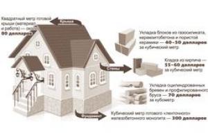Укладка кубометра оцилиндрованных бревен или профилированного бруса стоит около 70 долларов. Поставить сруб будет в два, а то и в три раза дороже. Возможно, вам понадобится пропитка деревесины, а это еще 30—40 долларов за кубический метр. Сборка каркасной “коробки” (а это балки перекрытия, силовой каркас, утеплитель, пароизоляция и т. д.) по расценкам фирмы составляет около 30—50 долларов за квадратный метр. Примерно в такую же цену обойдется и устройство кровли. Все зависит от сложности конструкции и кровельного материала.