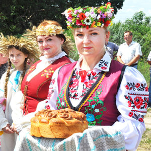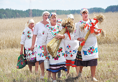 – Госпадзі, памажы, ды здароўем надзялі. Як стаіць гэтая лялька, каб так стаялі копы ў полі. Каб град не пабіў, дождж не намачыў, каб злы чалавек порчы не зрабіў, – напевно говорили жнеи в национальных костюмах с серпами на плечах, они же – участницы коллектива Белевского СДК. – Ну, жаначкі, давайце ўраджваць сноп!