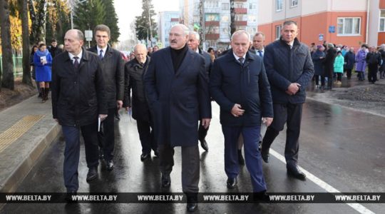 Александр Лукашенко прошел по центральной улице городского поселка, ознакомившись с благоустройством населенного пункта. В числе прочего заменено и отремонтировано дорожное полотно, отремонтированы социальные объекты, фасады домов и дворовые территории, обустроены современные детские и спортивные площадки, решен вопрос с обеспечением населения качественной питьевой водой за счет строительства станции обезжелезивания, уделено внимание озеленению территории.