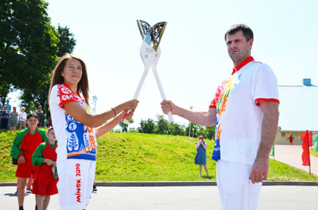 Первым, кому довелось пронести в руках один из главных символов мультиспортивного форума, стал Дмитрий Рябченко, гребец-каноист, пятикратный чемпион мира, шесть раз чемпион Европы, многократный победитель национальных и молодежных регат. Заслуженный мастер спорта Республики Беларусь. Стартовала эстафета вблизи гостиницы «Туров».