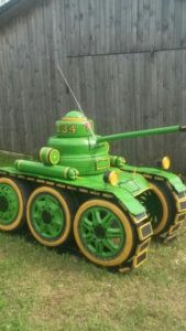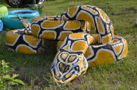 Всего за два месяца двор семейной пары превратился в настоящий музей. На небольшой площади разместились огромная змея, мотоцикл а-ля Харли-Дэвидсон, большие сказочные часы, танк Т-34, клумбы в виде чашек и цветов, а калитка стала напоминать замок.