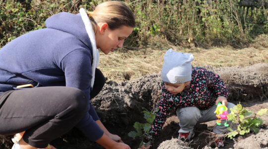 — Мама, мама, я сам, — пяцігадовы Ягор Аліфіравец, ўзброіўшыся маленькай, якраз па ўзросту, рыдлёвачкай, капае лунку, абярэжна, распраўляючы карэньчыкі, ставіць саджанец і прыграбае глебу да танклявага стволіка. — Гэта маё дрэўца, няхай расце вялікае-вялікае.