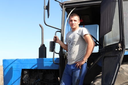 Ён не толькі старанна пашчыраваў на бульбяным палетку. Сімончык рупіўся і на жніве, дзе таксама дабіўся добрага намалоту. А вось яго калега Аляксандр Дубейка (на здымку справа) толькі робіць першыя крокі на сельгасвытворчасці. На трактары ўсяго некалькі месяцаў, перад службай у арміі вырашыў удасканаліць свае навыкі ваджэння.