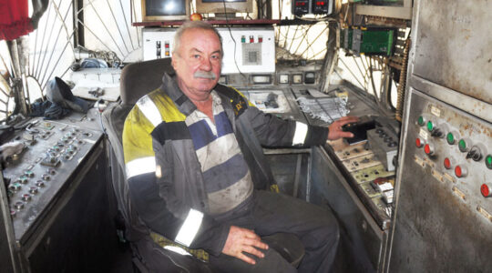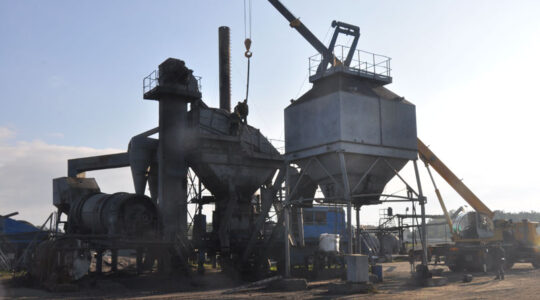 На самом высоком месте расположился наблюдательный пункт. Там с помощью компьютерного дистанционного управления и электрических заслонок оператор Иван Ерошик отмеряет нужное количество ингредиентов для производства асфальта. Сегодня эта высота пусть и пыльная, но не такая знойная как летом. Правда, здесь в стену вмонтирован кондиционер, созданный, наверное, до «исторического материализма». Но, как ни странно, работающий, пусть и мало сбивающий и совсем не добавляющий температуру. Тем временем процесс идёт. Все компоненты двигаются по заданному маршруту и, наконец, благодаря конвейеру, оказываются в аппарате для смешивания. Битум из-за его специфических свойств доставляют отдельно по трубопроводу. При низких t его утепляют. Все ингредиенты при вращении в подогретом барабане перемешиваются секунд 10, уверяет Иван Михайлович. Под воздействием вращательных движений и высокой температуры происходит их полноценная «интеграция» в асфальт.