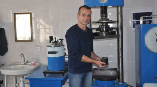 Финишируя, готовый продукт поступает в контейнер, где отбирается небольшая его часть для тест-контроля. Здесь же в лаборатории образцы проверяют на качество. Их отправляют под пресс и таким образом оценивают состав и прочность. После ОТК горячий асфальт грузят в самосвалы, чтобы доставить на место ремонта и строительства дорог.