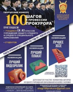 Проявить свои творческие способности могут учащиеся 9-11 классов и студенты в нескольких номинациях «Лучший плакат», «Лучший видеоролик», «Лучшее эссе». Работы могут быть коллективными. Дослать их можно на электронный адрес организатора shagil00prokuror@mail.com с пометкой «Творческий конкурс» до 1 февраля 2022 года. С условиями можно ознакомиться на официальном сайте prokuratura.gov.by — «Для СМИ» — «Конкурсы» —Творческий конкурс «Сто шагов к профессии прокурора».