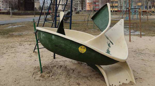 Единственная уцелевшая горка, пользовавшаяся спросом у малышей, судя по всему не выдержала напряжёнки. Конечно, можно было бы предположить, что сильный ветер сначала со всей дури запрыгнул на неё сверху и переломал, а уж потом из земли вырвал металлические опоры с куском бетона… Но несколько раз сама делала устные замечания великовозрастным лбам, указывая на то, что снаряд-то детский…