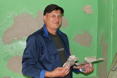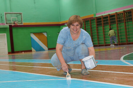 Пазнаёміўшыся з Надзеяй Штукар і Аленай Шулякевіч, якія акуратна наносілі баскетбольна-валейбольную разметку, адпаўляемся на трэці паверх. Тут завяршала «азеляненне» лесвічнай пляцоўкі цэлая каманда. Жаночую кампанію разбаўляюць усяго два рабочых. Аляксандра Аргера і Алега Ката засталі за тынкаваннем. Свежым растворам мужчыны рэаніміравалі ўчастак за дзвярыма аднаго з ганкаў школы. Некалькі чалавек фарбавалі металічныя элементы парт. Усяго рамонтам заняты звыш 35 чалавек, уключаючы штат кухні. Здаецца, ва ўстанове не засталося паверхні, да якой не дакранулася б рука з пэндзлем.