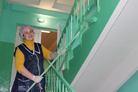 – Большую частку запланаванага аб’ёму ўжо выканалі, – Ганна Адамаўна папярэджвае пра асцярожнасць на прыступках са свежаафарбаванымі парэнчамі. – У кожным з 46 кабінетаў абнавілі падлогу, сцены і столь. Па-за ўвагай не засталіся і реакрыацыі з калідорамі. Прывялі да ладу адкосы і панэлі ў тых пакоях, дзе нядаўна мянялі вокны.