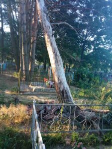 Юрий Александрович пояснил, что все деревья, которые повалила стихия, были своевременно убраны. Тем не менее, при выезде на место выяснилось, что «в результате ветра наклонило огромную сосну. И угрозу представляет это дерево только одному захоронению, больше там других нету».
