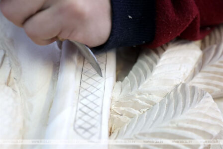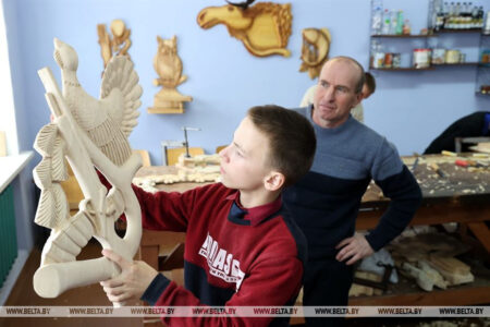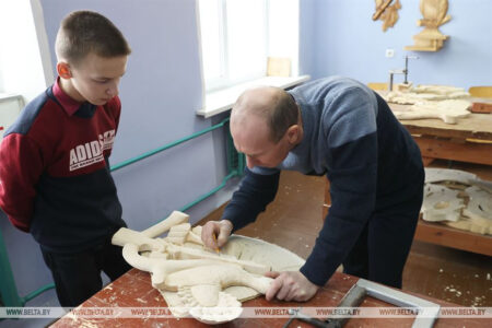 Мастера народных художественных ремесел ведут кружок резьбы по дереву для ребят из агрогородка Семенча