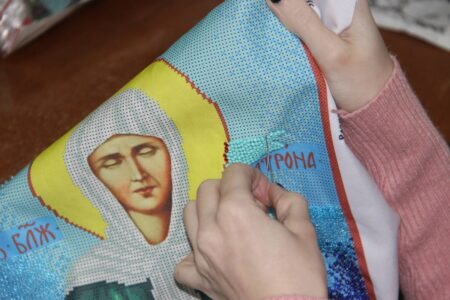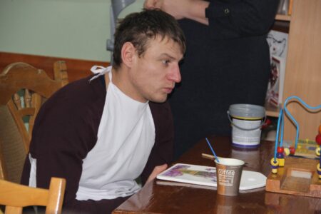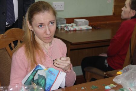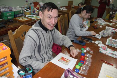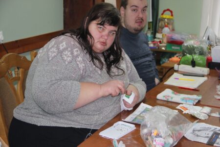 Не преминули гости посетить отделение молодых инвалидов, которое работает при центре и объединяет 28 ребят. Здесь они находят не только занятие по душе (как правило, сейчас всё больше вышивают бисером, рисуют), но и общение, чувствуя себя полноценными и равноправными. Удивительно, что среди их золотых рук, создающих иконы, есть и мужские. Андрею дело даётся сложнее и дольше, но работы отличаются аккуратностью. А вот Наталья за маленькие картины не берётся, любит размах. Творения талантов ТЦСОН продаёт, за вырученные деньги покупают материалы для творчества, организуют экскурсии. Директор центра Нина Романович отметила, что в прошедшем году мастеровитые руки посетителей и работников центра заработали 4 тысячи рублей и смогли посетить буквально каждый уголок района. Ребята обожают путешествовать, в том числе и виртуально. С удовольствием рассказали гостям, где бывали и что видели. Акция «От всей души» прикоснулась и к молодым людям – Иван Приходько передал им корзину со сладостями.