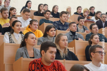 С молодежью ГГТУ имени П. О. Сухого встретились директор информационно-просветительского учреждения «Актуальная концепция» политолог Александр Шпаковский и заместитель генерального директора ОАО «Камволь» Егор Макаревич. В лекционной аудитории не было свободного места — около 100 студентов различных курсов пришли пообщаться со спикерами.