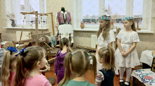 — Былі на капанцы, былі на кружанцы, былі на пажары, былі на базары, кармілі, варылі, вы іх не забылі? — задае дашкольнікам, што прыйшлі ў музей, загадку пра гліняны горшчык чацвёртакласніца Насця Ханавец. Апавядальную эстафету па чарзе падхопліваюць другія дзяўчынкі ў нацыянальных касцюмах — Злата Кароткая, Паліна Грыб і Вікторыя Севярын. Другі год яны праводзяць экскурсіі, і як расказалі пасля провадаў малышоў, ім гэта вельмі падабаецца, “каб дзеці не забыліся, як жылі нашыя бабулі, гэта ж вельмі цікава”.