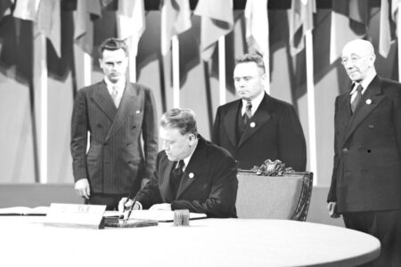 Но вернёмся на какое-то время назад. Как известно, Организация Объединённых Наций была образована 25 апреля 1954 года. Но ещё задолго до этого дня, 6 мая 1945 года, белорусская правительственная делегация под руководством наркома иностранных дел БССР Кузьмы Киселёва прибыла в американский город Сан-Франциско, чтобы принять участие в конференции по подготовке Устава ООН.