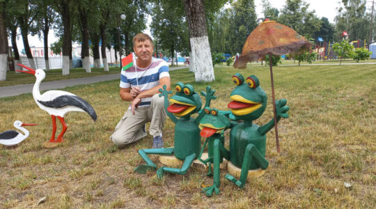 Помимо чисто утилитарных вещей — этажерки, качелей или скамеечки — Фёдор Дмитриевич как незабвенный Папа Карло творит и разные фигурки для украшения двора и сада. Вот улыбчивая компания лягушат присела на полянке, в возок с цветами запряглись муравьи-трудяжки, а на фасаде дома распростёрли крылья сказочные гуси-лебеди. Идеи для малых архитектурных форм житковчанин черпает повсюду. Зацепить может что угодно — иллюстрация из детской книжки или картинка на сувенирном магнитике, а то от внучат, первых ценителей его таланта, заказ на конкретного зайчика или котика поступит. Следующая ступень — поиск технического решения или, проще говоря, составление плана, что и как делать. И только потом наступает захватывающий процесс рождения сказки.