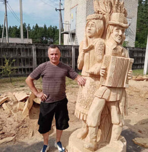 Яго рукамі шмат чаго з палена трансфармавалася ў «бурацін». Больш за тое, даўно выплюхнулася за межы Беразіны, цешачы і ўслаўляючы Жыткаўшчыну. Вось разьбяр па дрэве летась заваяваў першае месца ў абласных спаборніцтвах майстроў. Работа накіравалася на рэспубліканскі этап. А перад гэтым яго сасновыя бабка з дзядком, які грае на гармоніку, абышлі ўсіх канкурэнтаў у Ляскавічах на «Клічы Палесся». Дарэчы, яна здаецца з філасофскім акцэнтам – у ног вясёлай пары гадзіннiк, адлічваючы час, быццам застылі ў ім.