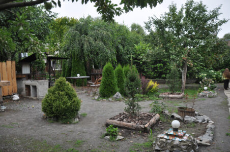 А ведь ещё лет десять назад два дома в Кремном, доживая свои финишные лета, не подозревали, что в Москве у Дмитрия созрела мечта. А вместе с нею появился и план, вдохнувший жизнь и движение в крохотную белорусскую деревеньку. За забором, с предупреждающей табличкой о разгуливающей по двору собаке и адресом ближайшего травмпункта в Житковичах, воображение неожиданно сражает альпийский пейзаж. Однако уютная стена туй, почти райский яблонево-грушевый и черешневый сады – лишь антураж к главному действу, что влечёт столичных туристов.