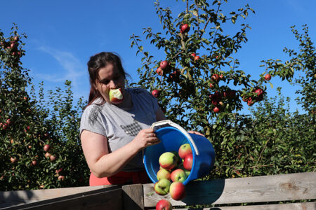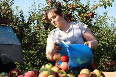 В тот день бригада трудилась на 107-гектарной плантации, что ближе к Ричёву. Вторая площадка у туровского кольца в этом сезоне практически «отдыхает». Добраться до высоких, усеянных красно-зелёными «шарами» веточек, людям помогают стремянки. Яблоки аккуратно (неповреждённый фрукт лучше хранится) срывают с дерева и отправляют в вёдра, которые потом высыпают в большие ящики, что на тележках между рядов тянет трактор.