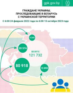 Всего с 24 февраля прошлого года в Беларусь с украинской территории прибыли 121 732 гражданина Украины: через украинско-белорусскую границу проследовали 15 895 человек, транзитом через Польшу — 80 918, через Литву — 20 574, через Латвию — 4345.