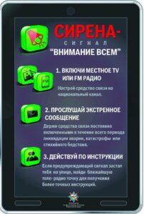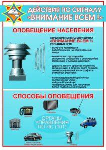 Помните, что при подаче сигнала «Внимание всем!» путем включения электромеханических сирен, специализированных технических средств оповещения, а также других сигнальных средств, необходимо включить радиоприемник и прослушать экстренное сообщение о сложившейся обстановке и порядке действия населения. Полностью прослушав и поняв речевую информацию, необходимо выполнить все рекомендации.