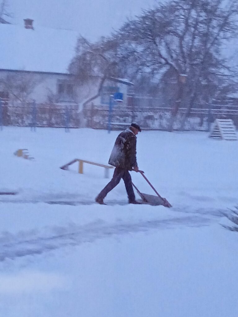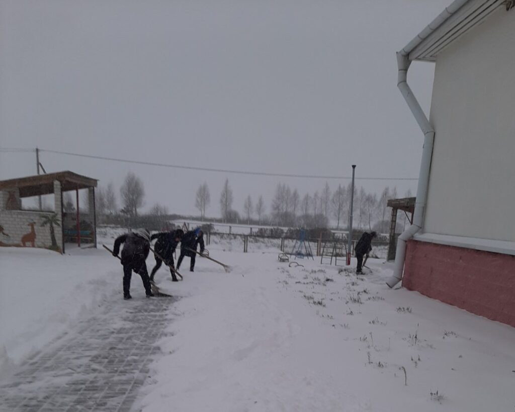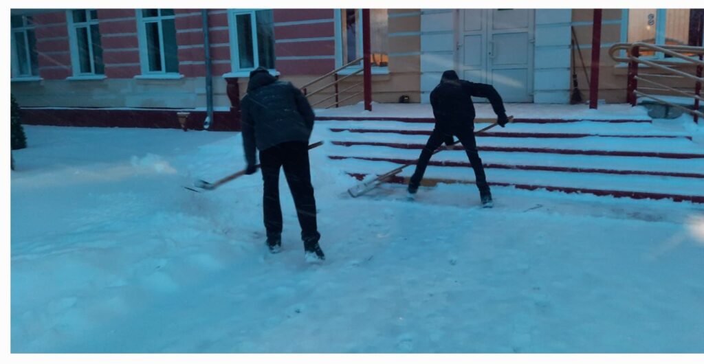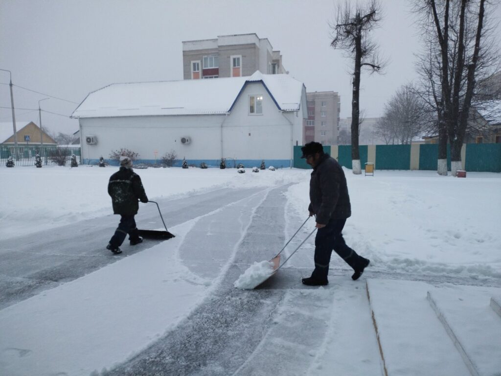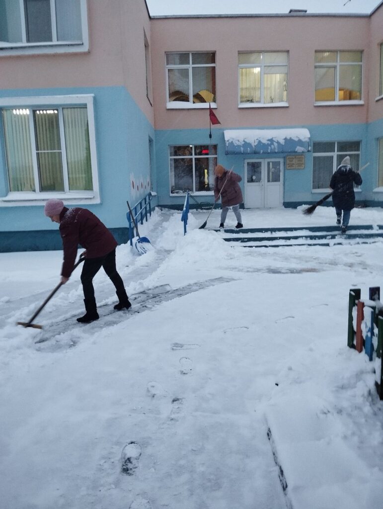 Утро в учреждениях образования района сегодня началось активно. В ход пошли лопаты. Работники школ чистят территорию от снега.