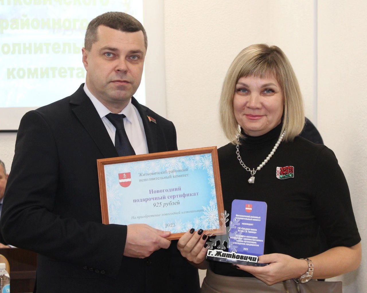 В районном исполнительном комитете наградили победителей городского смотра-конкурса на лучшую новогоднюю композицию, установленную на центральной площади Житкович, и лучшее новогоднее оформление фасадов зданий и прилегающих к ним территорий предприятий, учреждений, организаций.