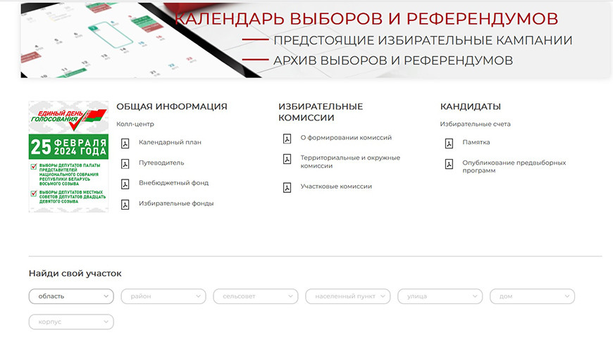 На главной странице официального сайта Центральной избирательной комиссии запущен сервис по поиску участка для голосования. Об этом БЕЛТА сообщили в ЦИК.