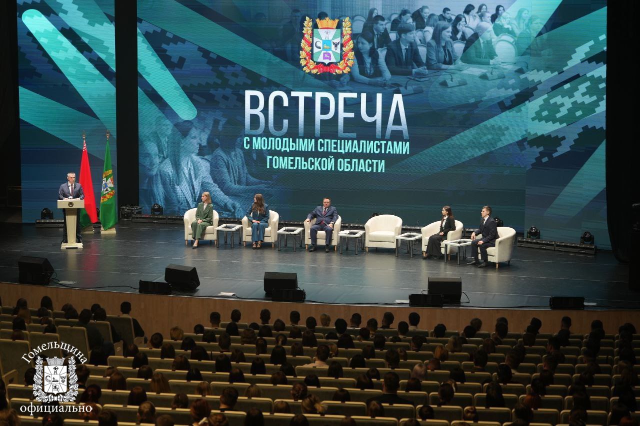 Всего на встречу с губернатором собрались более тысячи молодых специалистов. В диалоге участвует помощник Президента – инспектор по Гомельской области Юрий Горлов.
