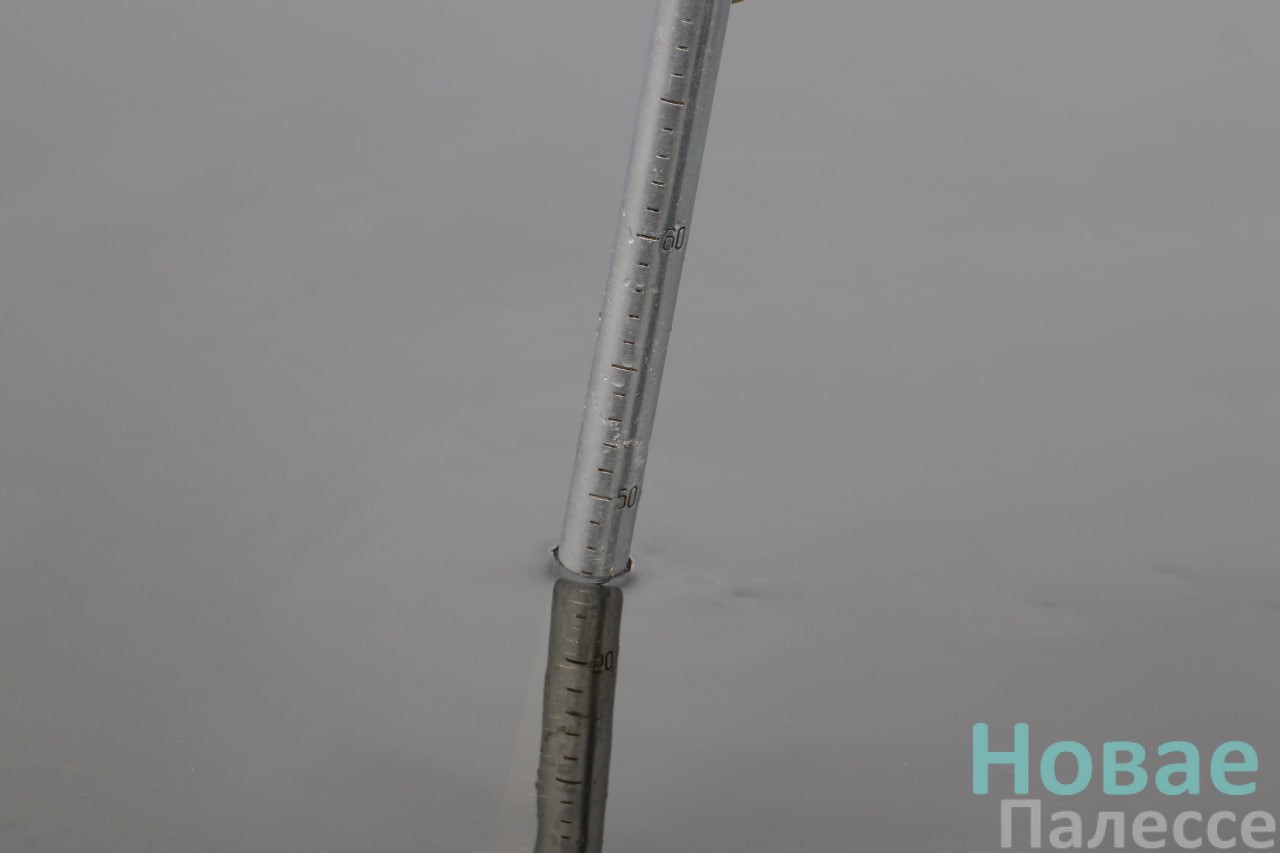 Тем временем мы уже на месте. Маленькое кирпичное здание с говорящей вывеской и есть гидрологический пост. Его построили здесь вместе с мостом в 1986 году. До этого за рекой следили в пригороде Турова – Дворце. Александр Дмитриевич обращает внимание на расположенный рядом столбик или правильно сказать «репер». Это нулевая отметка, от которой ведётся отсчёт уровня воды. Напротив, по бетонному спуску через определённые промежутки установлены сваи с белыми головками. Каждая отмечает свою высоту. Чтобы продемонстрировать принцип, мужчина надевает рыбацкие сапоги и, вооружившись специальной рейкой с делениями, по ступенькам заходит в реку. Ставит «линейку» на крайний столбик, уже ушедший под воду, и фиксирует цифру, затем добавив к ней «высоту» сваи, выдаёт, что Припять в этот момент остановилась на отметке 519 см, отминусовав от недавнего максимума 5 сантиметров. К слову, на его профессиональной памяти рекордно Припять поднималась до 650 см, а летний минимум доходил всего до 132 см.