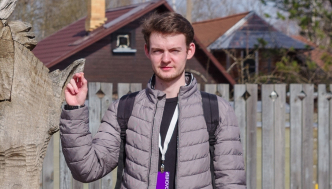 Максим в марте побывал на молодежном форуме имени Александра Невского, который был посвящен волонтерству. Фотография сделана у музея «Домик няни А. С. Пушкина» в Кобрино Ленинградской области