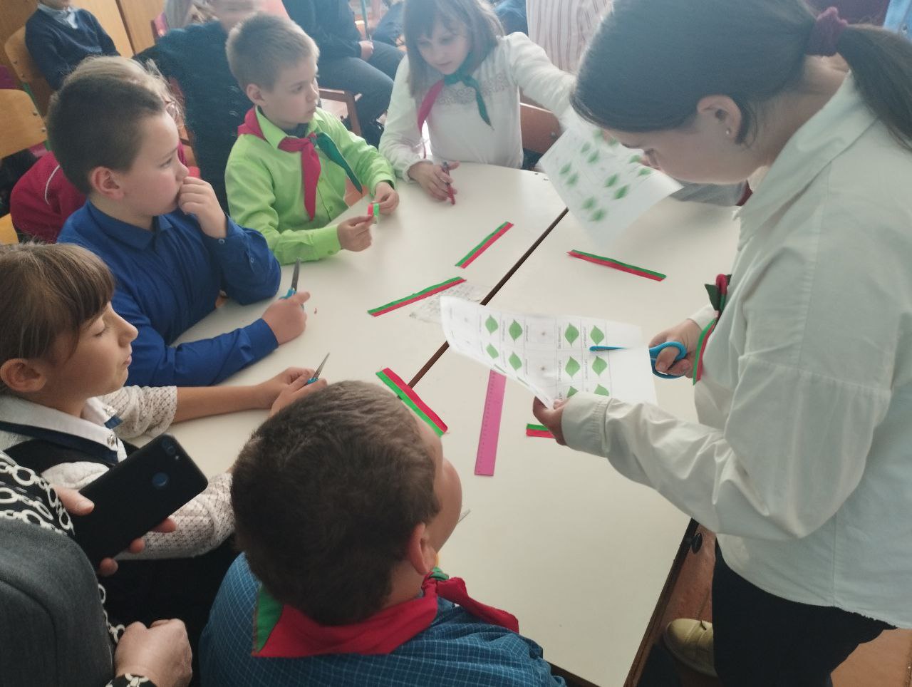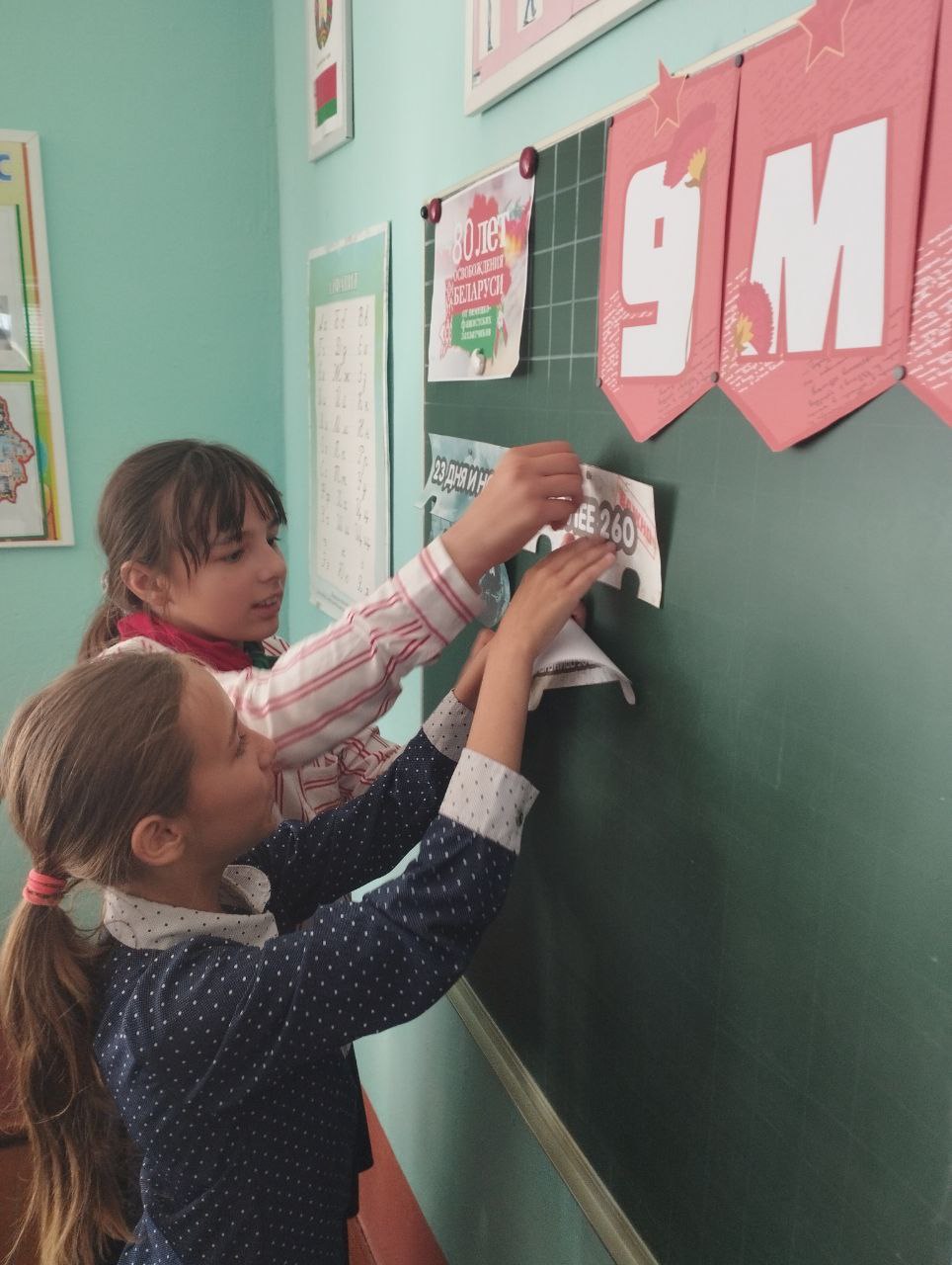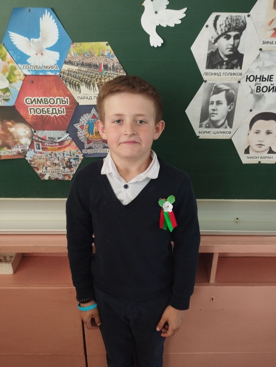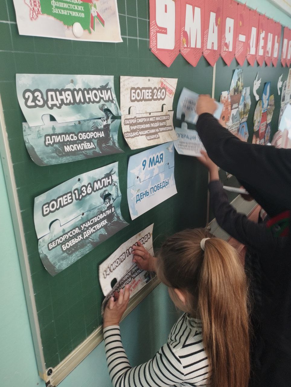 О вкладе белорусского народа в ПОБЕДУ рассказывали не только педагоги, но и ученики школы. Члены БРПО провели единый урок для учащихся начальных классов. Ребята рассказали младшим школьникам о маленьких героях Великой Отечественной Войны, о мемориальных комплексах Республики Беларусь Дети собирали пазлы «Война в числах» и сделали бутоньерку — Цветок Великой Победы.