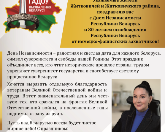 Read moreУважаемые жители Житковичского района! Поздравляю вас с Днём Независимости Республики Беларусь и 80-й годовщиной освобождения нашей страны от немецко-фашистских захватчиков!