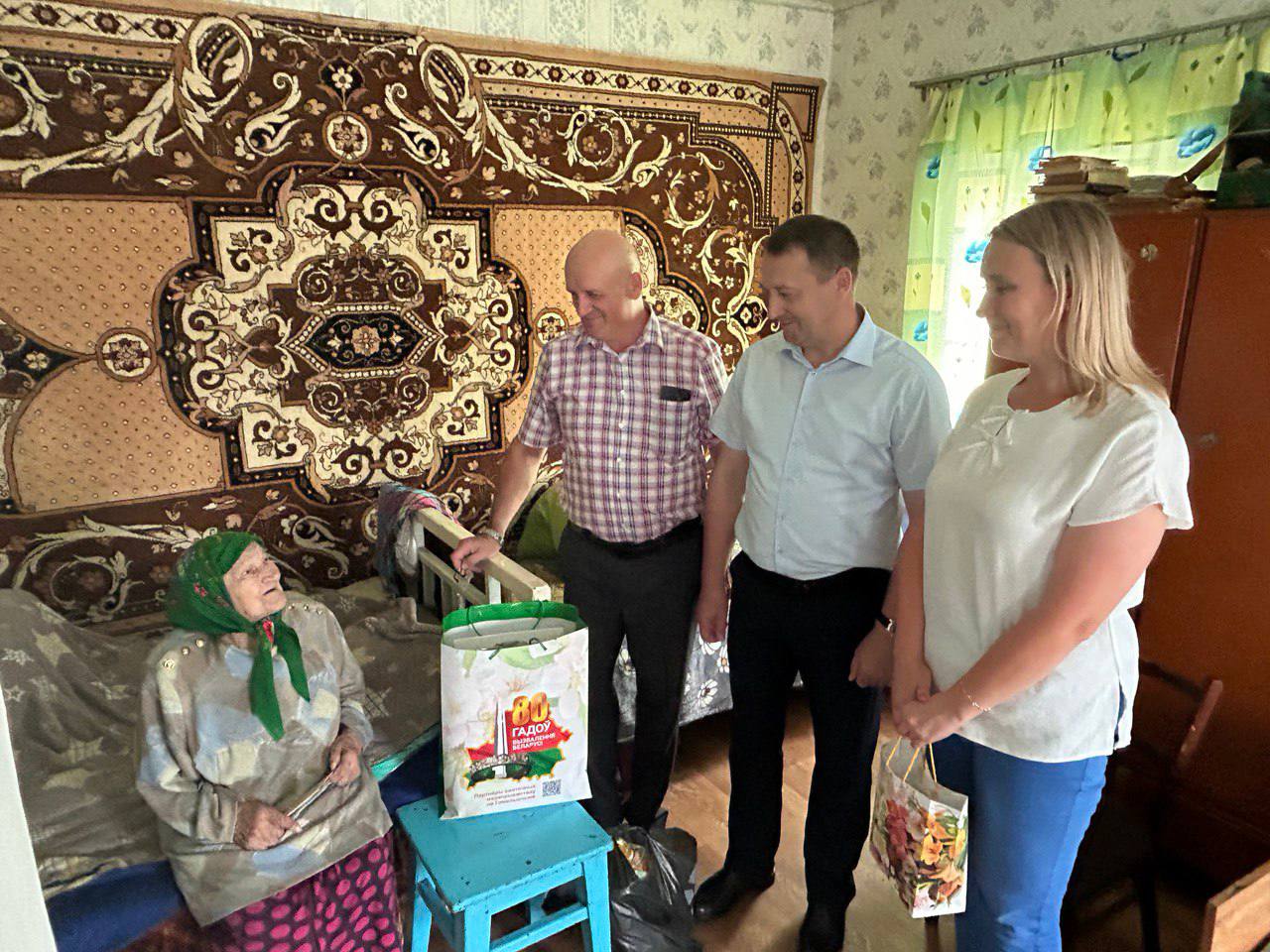 Поздравления с наступающими праздниками от главы государства, а также памятные подарки от депутатского корпуса района ветерану войны сегодня вручили председатель районного Совета депутатов Леонид Волотовский, глава Люденевичского сельсовета Юрий Волчик, а также лидер профсоюзной организации Житковичского лесхоза Ольга Пьявко.