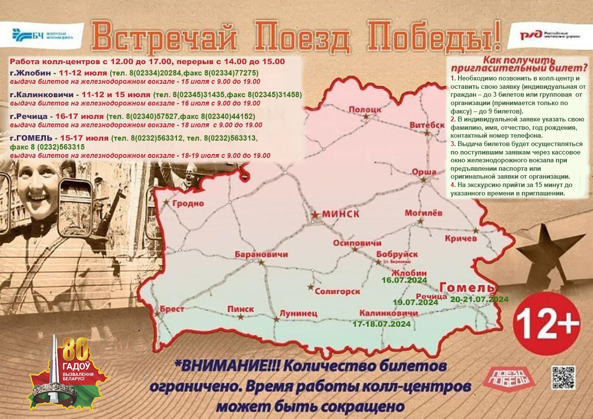 Гомельская область встречает «Поезд Победы». Уникальный музей на колесах сделает остановки в Жлобине, Калинковичах, Речице и Гомеле с 16 по 21 июля