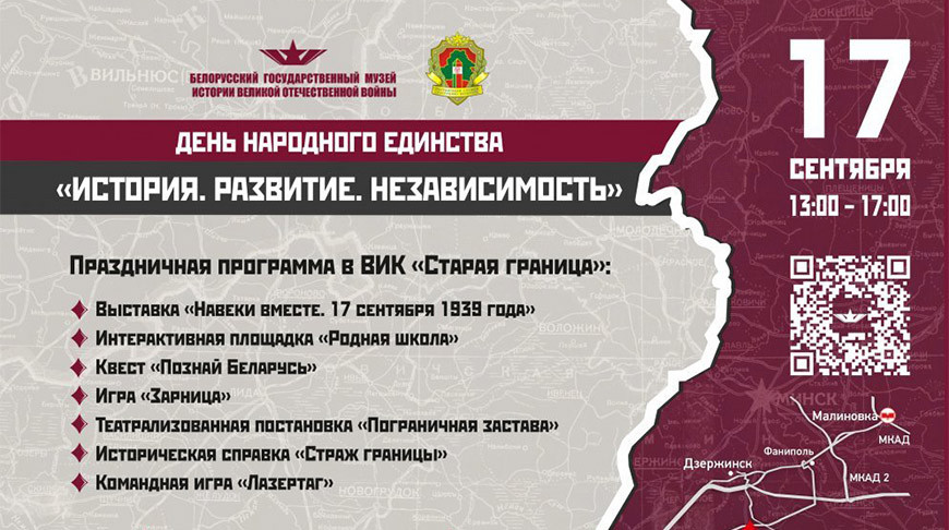 Гостей ожидает масштабная праздничная программа. Они смогут посетить выставку под открытым небом «Навеки вместе», посвященную 85-летию восстановления исторической справедливости — объединению Беларуси, увидеть театрализованную постановку «Пограничная застава», которая расскажет о жизни и быте пограничников 30-х годов ХХ века, а также погрузиться в культурное и историческое наследие страны с помощью квеста «Познай Беларусь».
