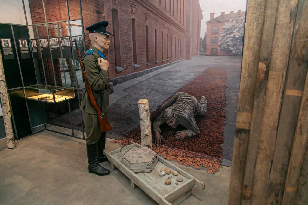 Залы музея – камера узников и карцер – действительно дают представление о жестоком отношении к заключенным. Двухъярусные деревянные нары, застеленные соломенными матрасами, зарешеченные окна, бетонный пол и фигуры узников в арестантской робе. А прочувствовать атмосферу этого жуткого места позволяет VR-технология, с помощью которой достигается эффект погружения в прошлое.