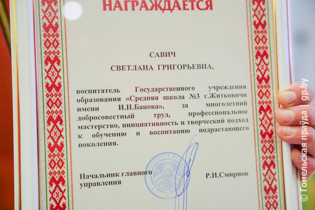 Как отметил начальник главного управления образования облисполкома Руслан Смирнов, педагоги Гомельщины – это многотысячная армия профессионалов. Только в этом году в городские и сельские коллективы приняли боле 800 молодых специалистов. Их радушно встретили на местах. Для молодежи предусмотрены пологающиеся выплаты, в зоне радиационного загрязнения действует серьезная система контрактных надбавок. Руководитель ведомства поблагодарил коллег за неоценимый труд и поздравил с профессиональным праздником. Слова благодарности звучали и из уст председателя областной организации Белорусского профсоюза работников образования и науки Жанны Жданович.