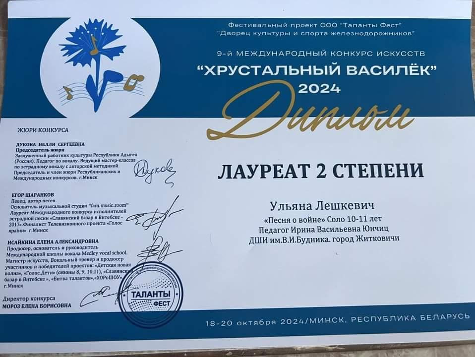 Ульяна Лешкевич, пятиклассница средней школы №2 г. Житковичи, достойно выступила на 9 международном конкурсе искусств «Хрустальный василёк — 2024», который прошёл в Минске.