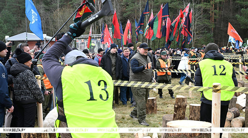 Президент Беларуси Александр Лукашенко посетил чемпионат по колке дров среди журналистов, передает корреспондент БЕЛТА.