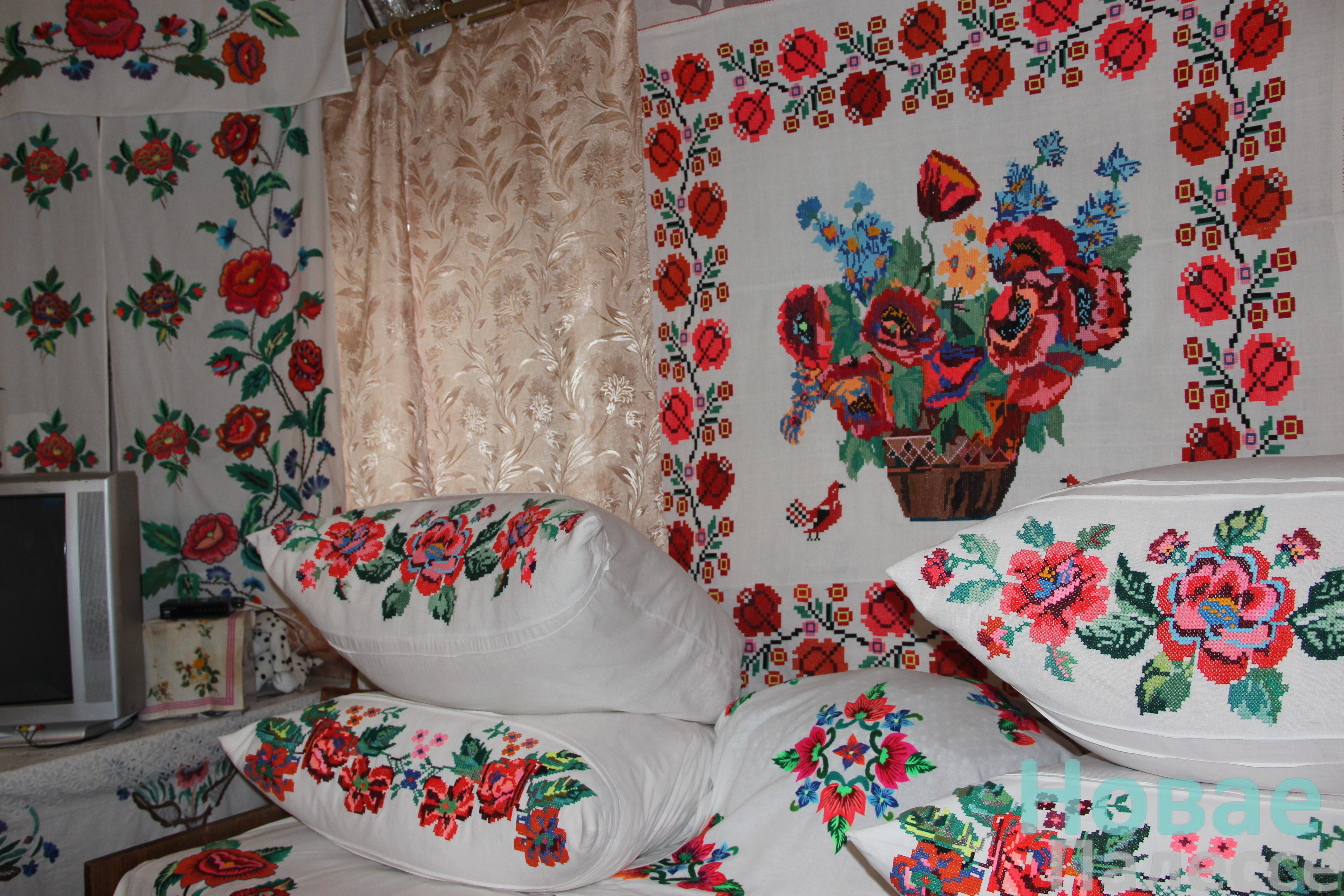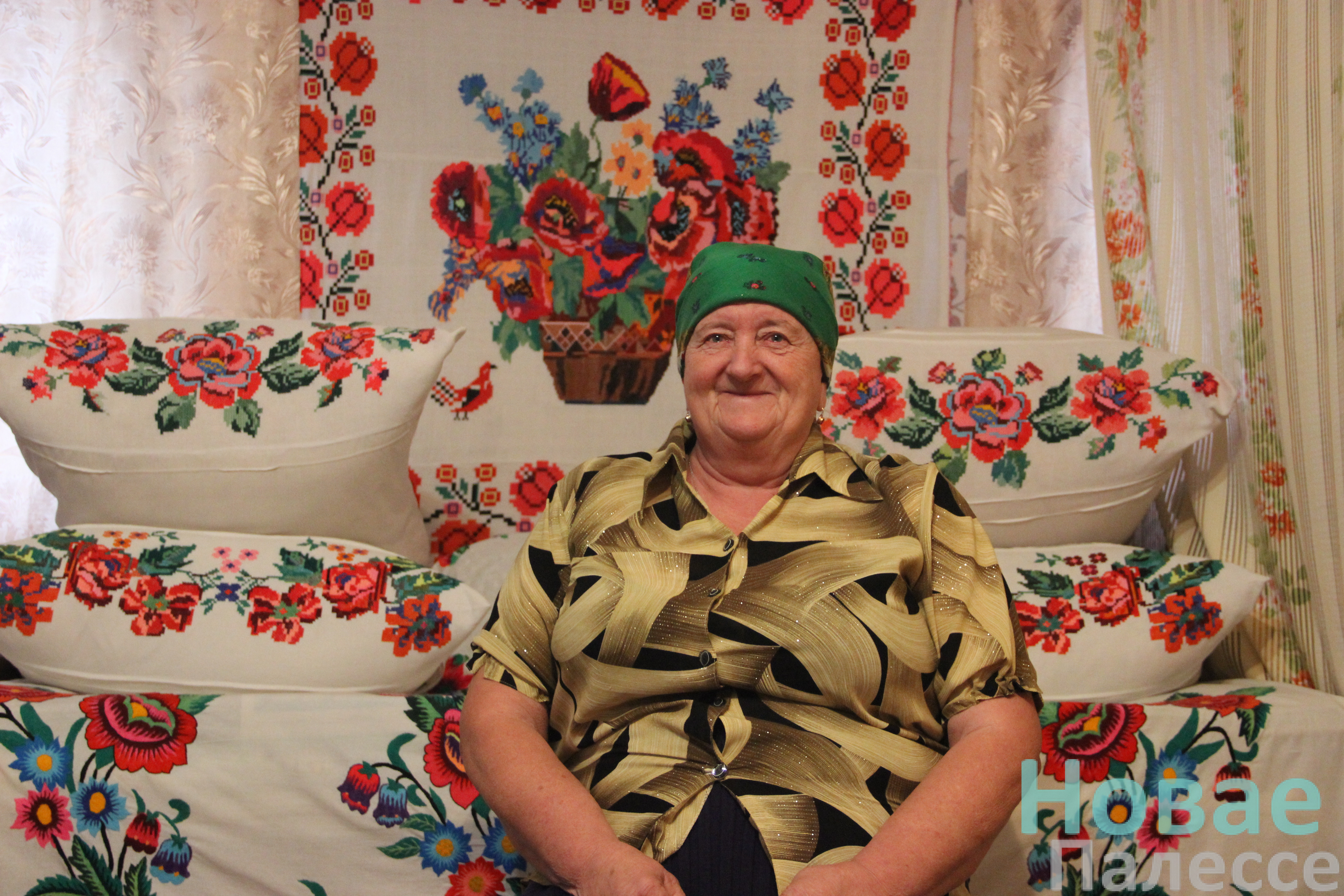А вось і патрэбны нам адрас. Жоўценькага колеру акуратная хатка прываблівае здаля. За плотам не па-снежанску зелянеюць ружы. Можна ўявіць, якая прыгажосць тут летам. Але па-сапраўднаму здзіўляемся, пераступіўшы парог вялікага пакоя. Цэлы музей вышываных рэчаў! Ад яркіх дыванкоў на сценах, пярэстых пакрывал і навалачак вее атмасферай далёкага вясковага дзяцінства.