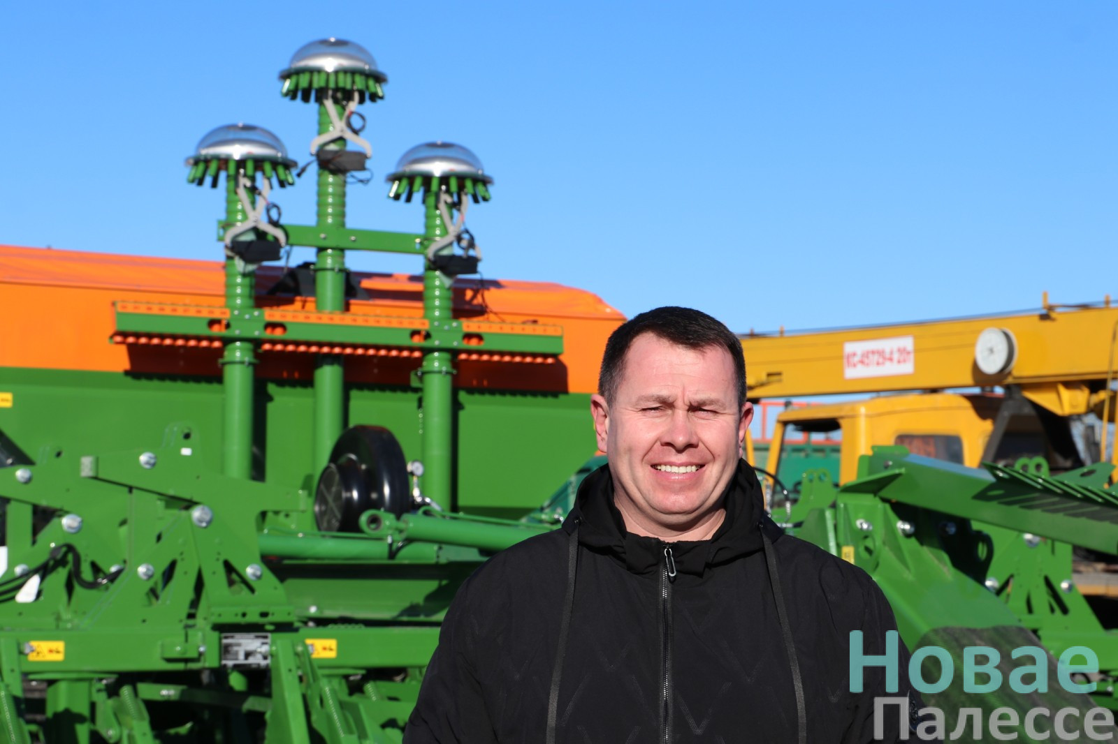 На мехдвары «Знаменка» блішчыць на сонцы зялёным колерам новы пасяўны агрэгат. Два маладыя мужчыны, прадстаўнікі арганізацыі-пастаўшчыка, вядуць яго наладку.