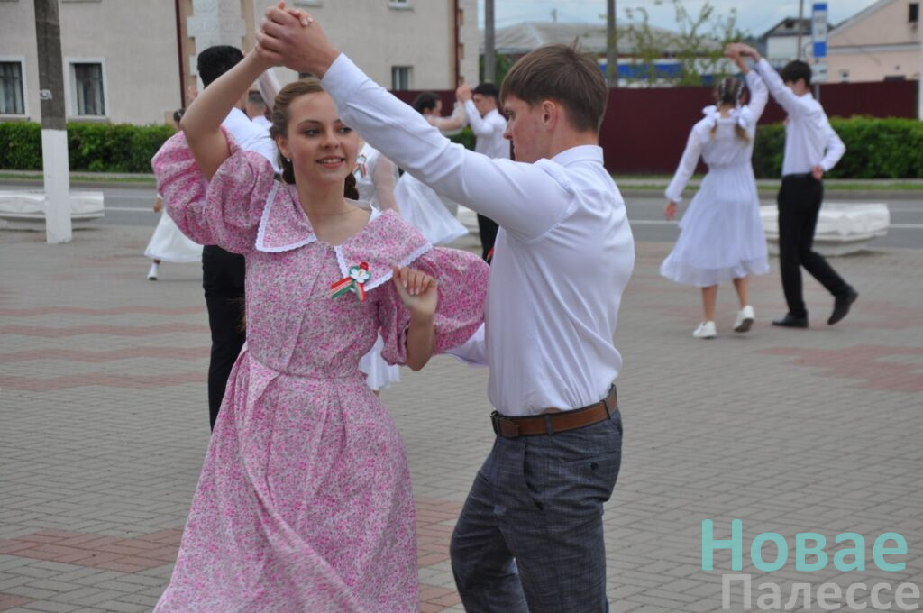 Акция «Танцуем вальс Победы вместе» закружила около Городского дома культуры в Житковичах молодёжь. 18 танцевальных пар из учреждений образования Житковичей исполнили «Майский вальс».