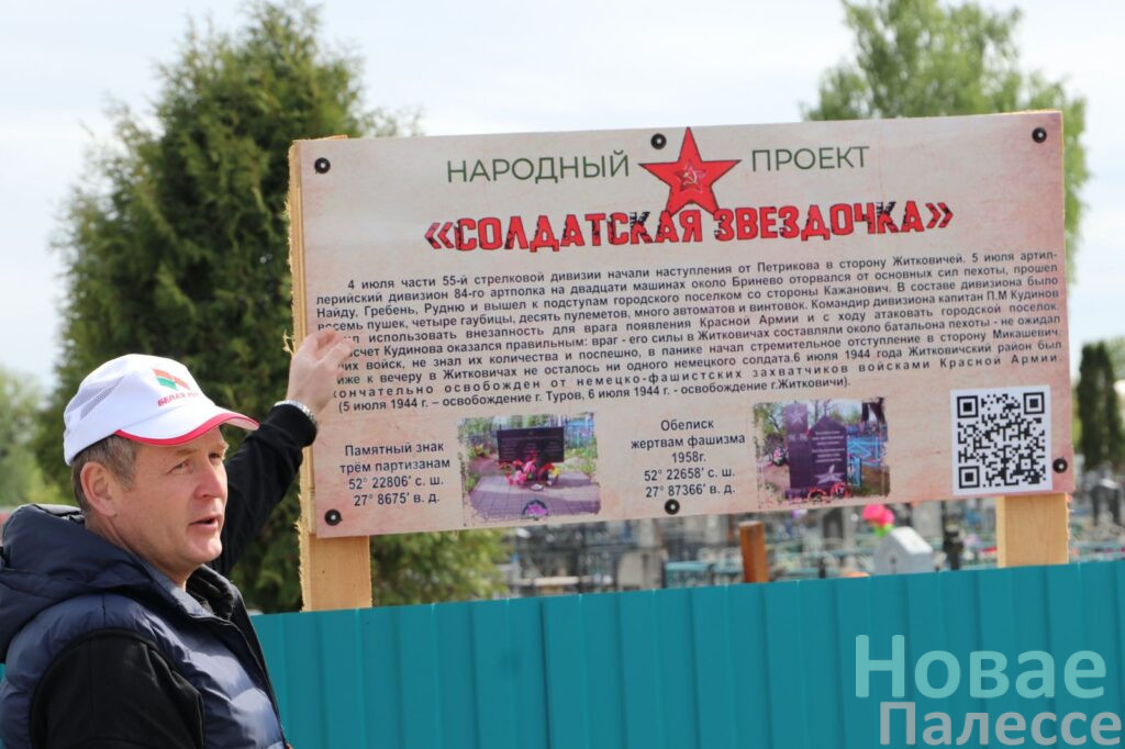 У памятника погибшим партизанам и красноармейцам участников акции приветствовал начальник отдела идеологической работы и по делам молодёжи райисполкома Сергей Агиевич. Звучит команда: «Колонна, на старт!» Первым пунктом маршрута стала площадка у городского кладбища, где установили специальный стенд, информирующий о народном проекте «Солдатская звёздочка». На табличке есть QR-код, посредством которого можно перейти на страницу Туровского краеведческого музея, где рассказывается о наступательной операции по освобождению Житковичей от немецко-фашистских захватчиков.