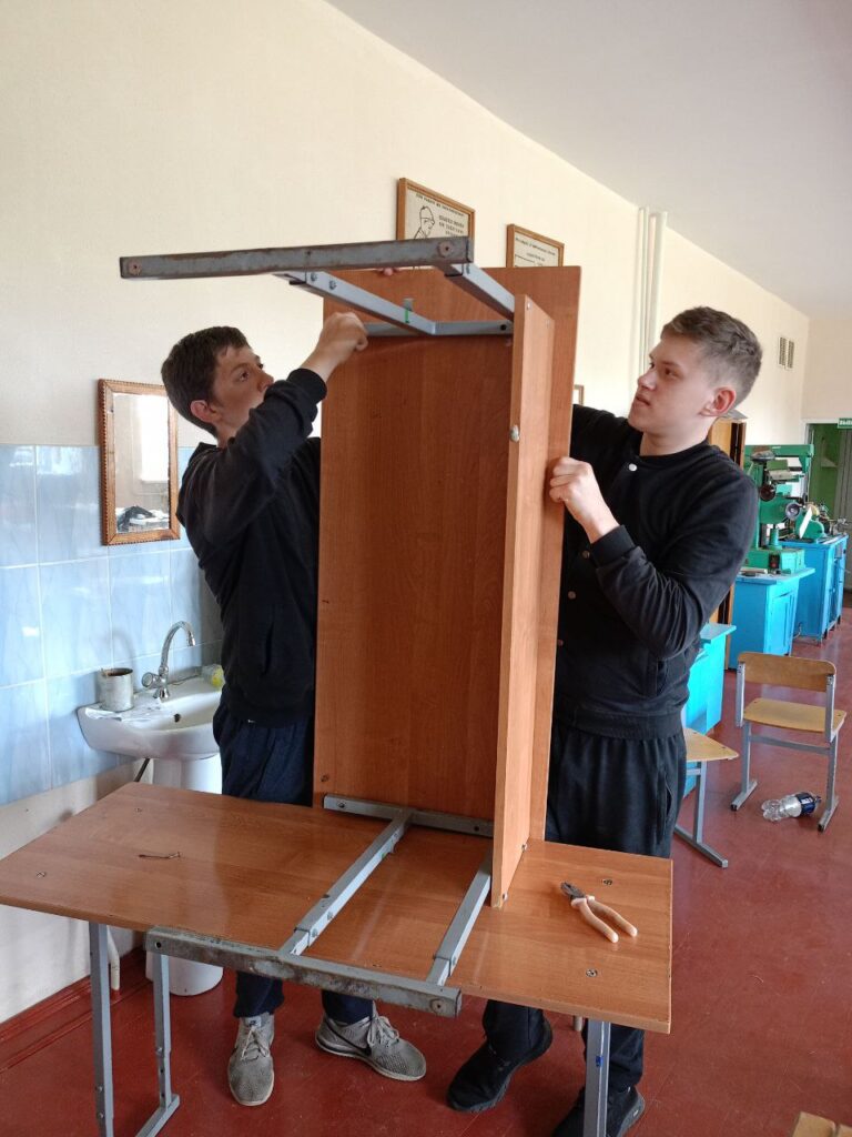 С утра в мастерской школы кипит работа. Мальчишки под руководством педагога трудового обучения Александра Пашевича обновляют столешницы парт и сиденья ученических стульев, то есть ремонтируют школьную мебель для кабинета белорусского языка и литературы.